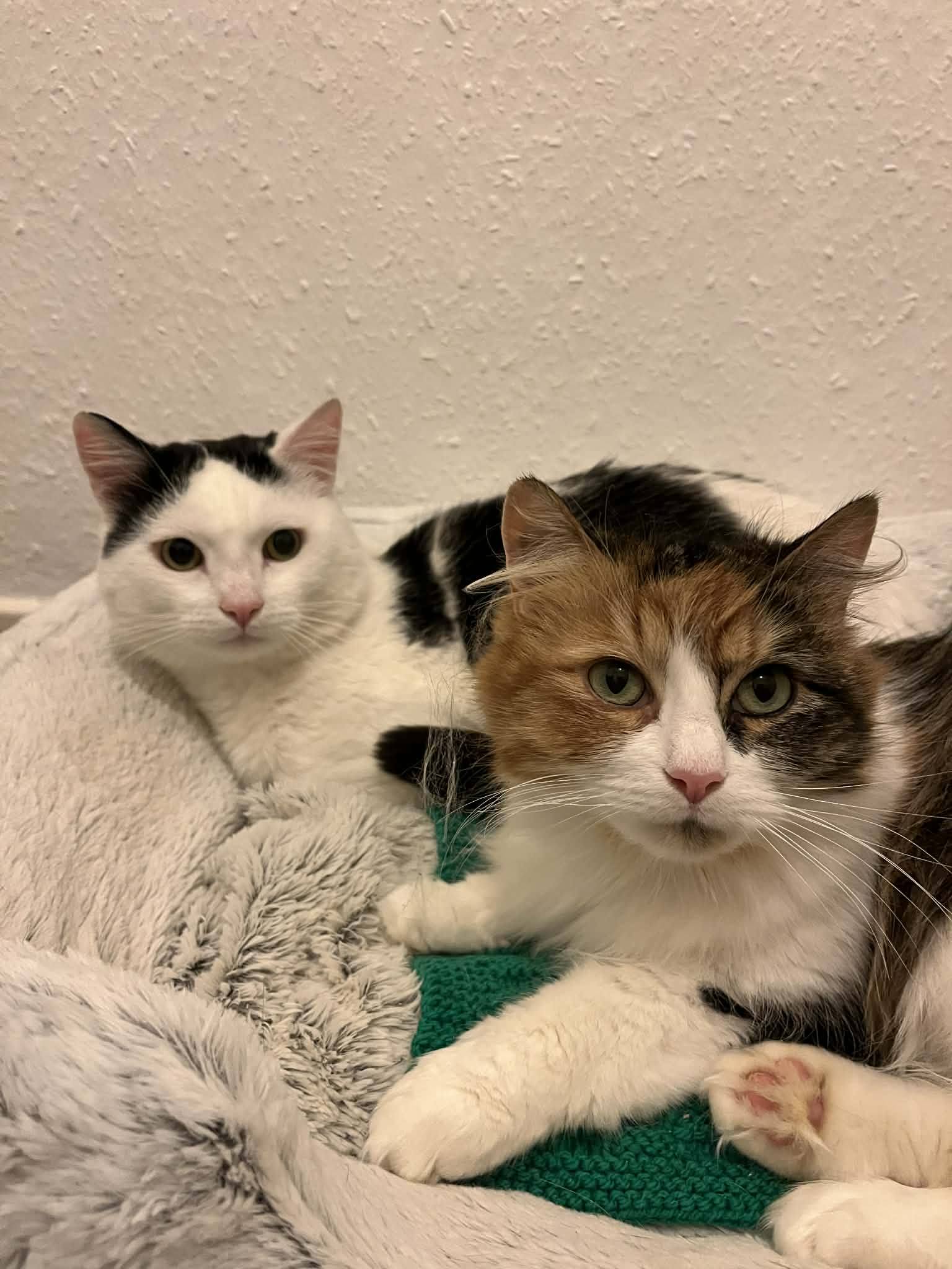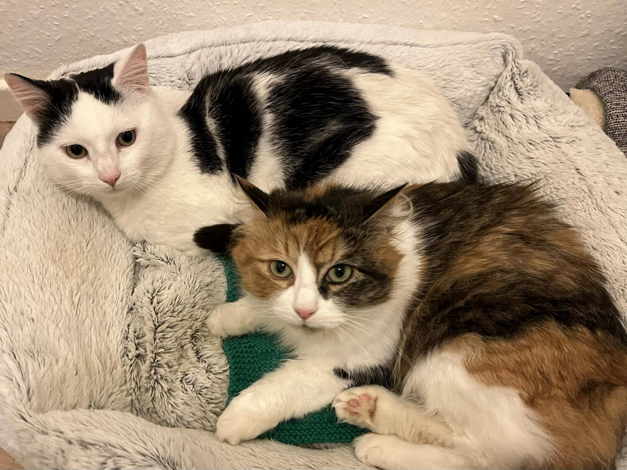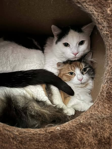 Eddie, a handsome black and white boy, and Ellen, a glamorous long-haired calico, are a young pair around 1–2 years old who share a truly special bond. They are looking for a forever home together, as they rely on each other for comfort and companionship. Wherever one goes, the other is never far behind.