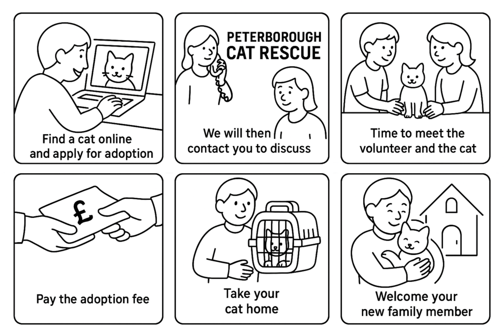 We hold regular Homing Days (check our Events Page & Facebook page for details). If you spot a cat you’re interested in via our adoption page then send an enquiry using the form below the cat, we’ll arrange a meet-up with one of our foster carers.